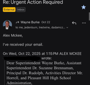 The incidents, the young man writes in his lawyerly email to the district, “span more than one year and demonstrate a sustained, deliberate, and egregious pattern of inappropriate conduct by [the teacher], including political indoctrination of a minor student, boundary violations that suggest predatory attention, intimidation and implicit threats, apparent retaliation for protected speech and advocacy, and ongoing breaches of confidentiality that have exposed me to public harassment and humiliation.”