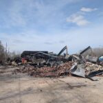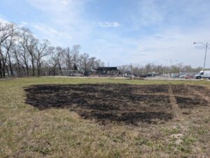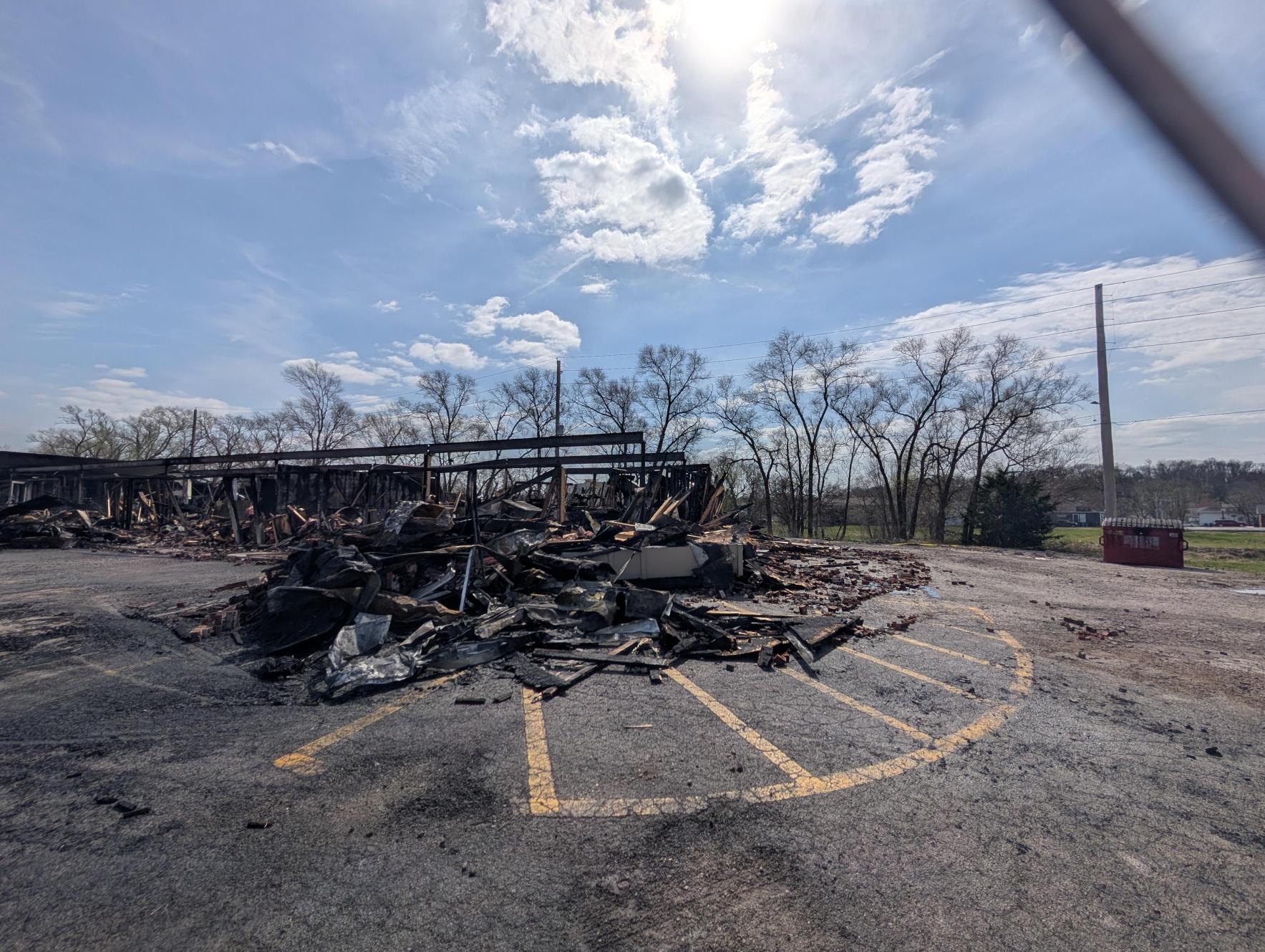 The wind blew embers and chunks of burning material, which increased the potential for other fires to start. Roughly 100 feet away in the lot east of the plaza, some grass caught fire and spread to the dumpster behind Burton’s Bait and Tackle, which was not connected to the plaza.